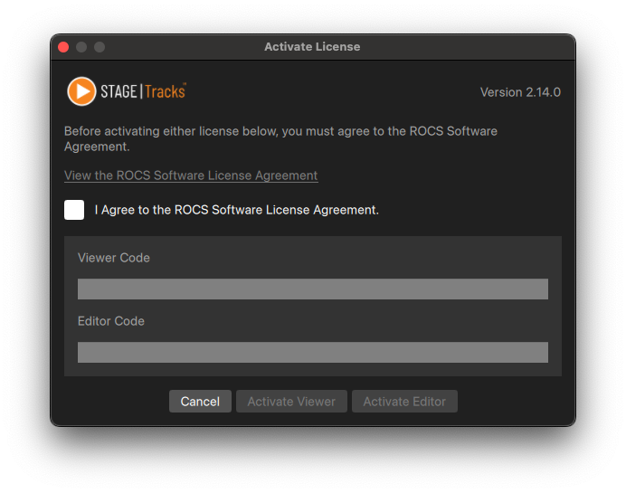 The first time you launch Stage|Tracks on Mac or Windows, a pop-up window will appear asking you to agree to the Right on Cue Services (ROCS) software license agreement and input your access codes. This notification also includes the software version number.
