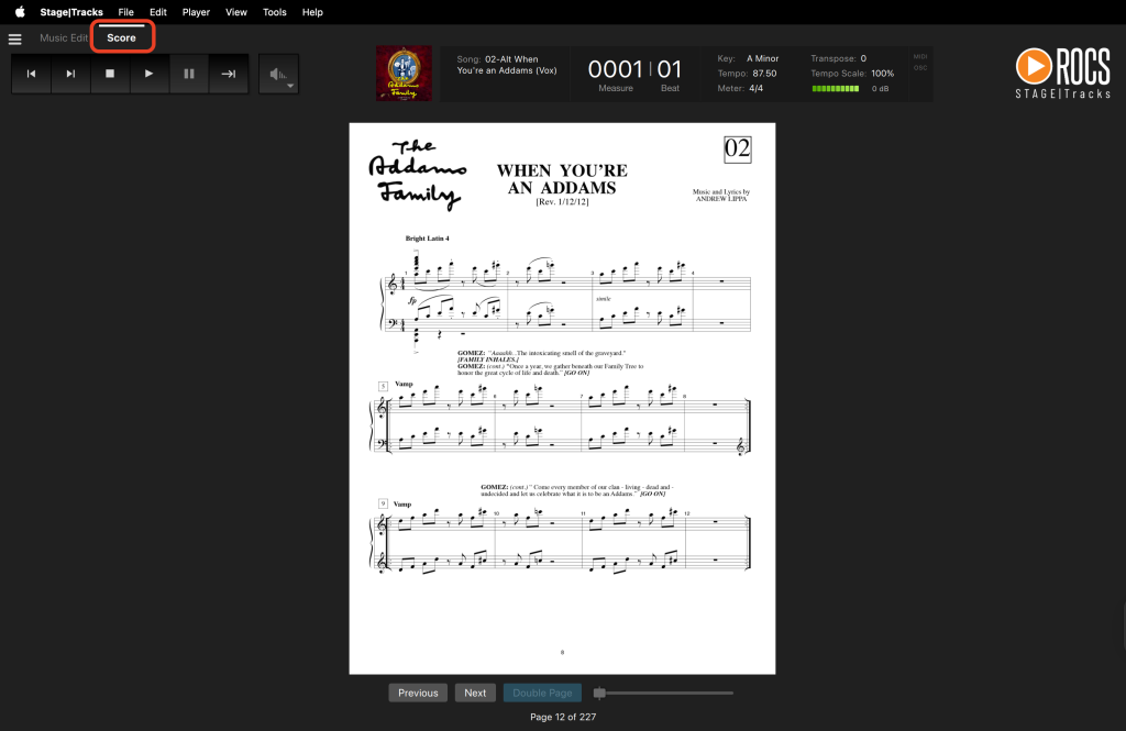 Below is the score window of the selected song. You can access it by clicking on theย Scoreย tab at the top of the page. By default, all events inย Stage|Tracksย match exactly as listed in theย score. You can click onย Music Editย to get back to the main view.