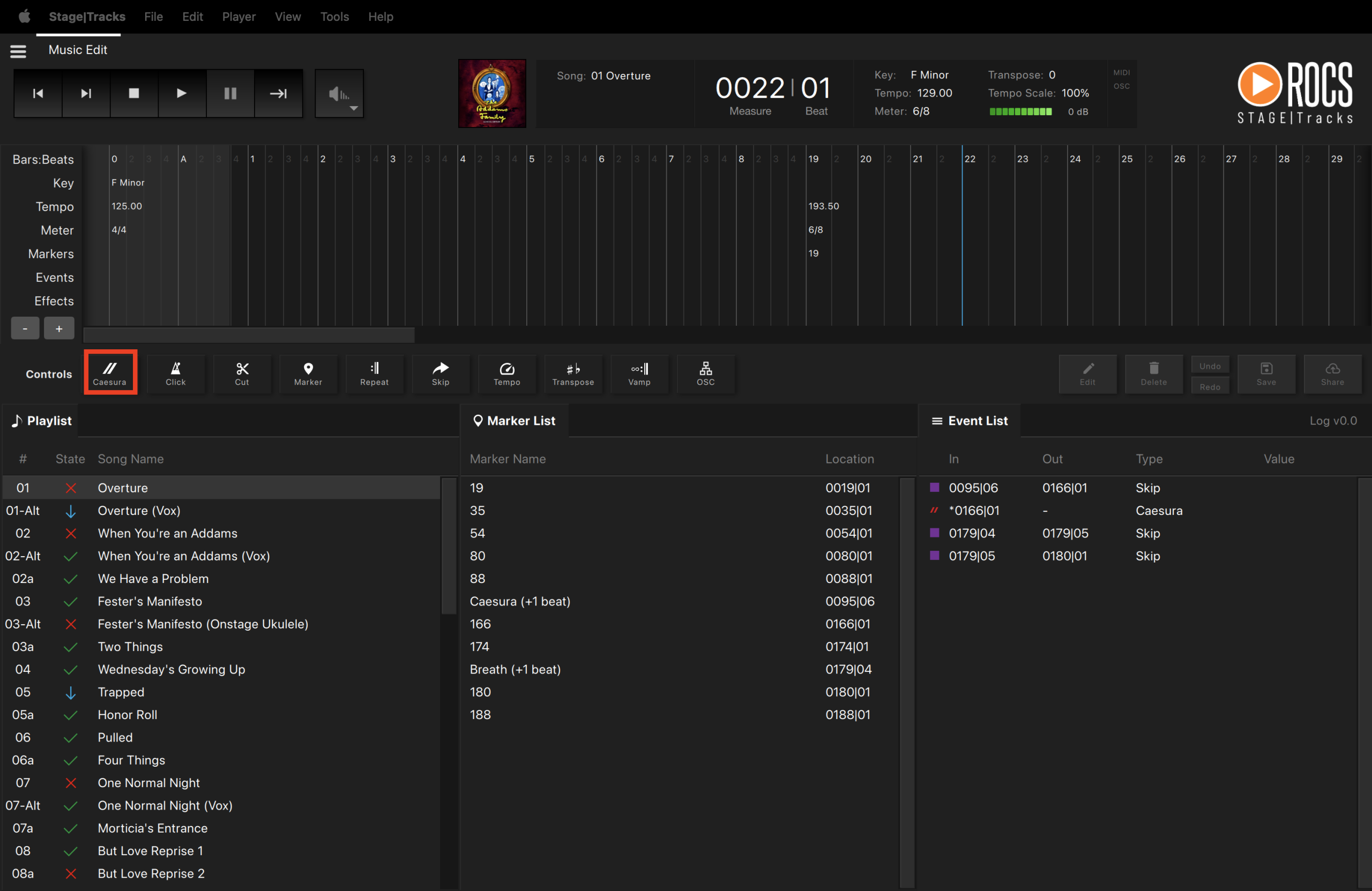 - Make all general edits cast B (vamps, cuts, tempo, transposition, etc.) and note the event log number.